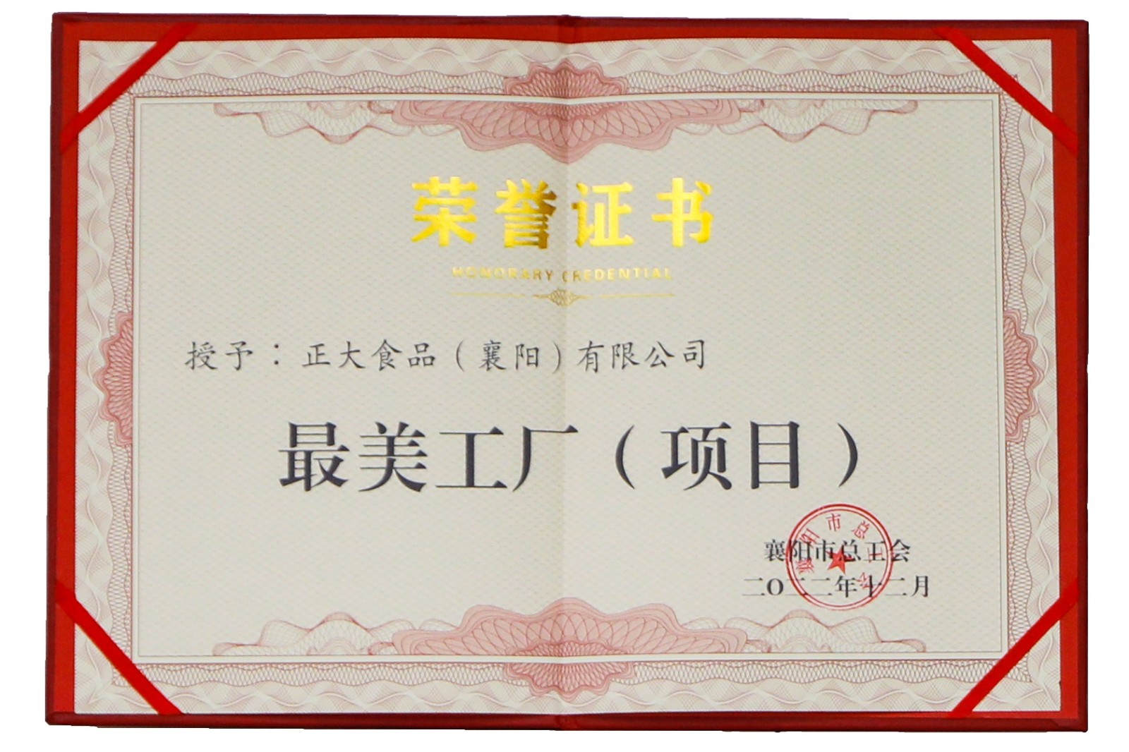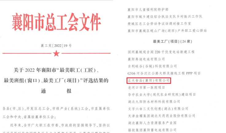 为广泛开展美好环境与幸福生活共同缔造活动,评选为襄阳市经济社会高质量发展做出积极贡献的单位和群体及个人,襄阳市总工会开展了寻找襄阳市“最美职工(工匠)、最美工厂(项目)、最美班组(窗口)”的活动。历时2个月的多轮评定,襄阳市总工会决定授予正大食品(襄阳)有限公司——襄阳市“最美工厂(项目)”奖项。